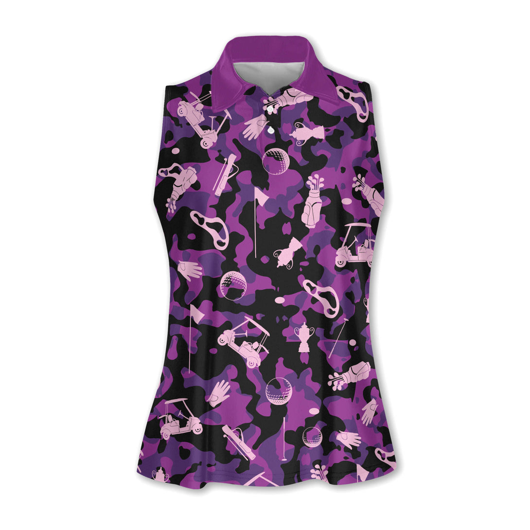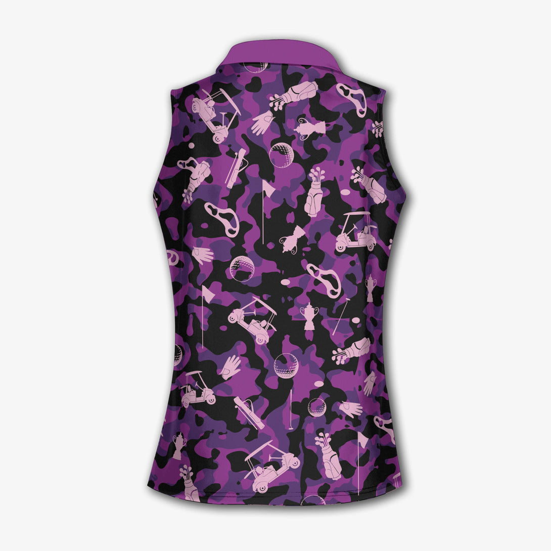Purple Camo Women's Sleeveless Golf Shirt, Camouflage Golf Shirts For Women H0168