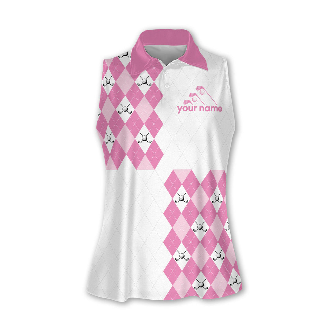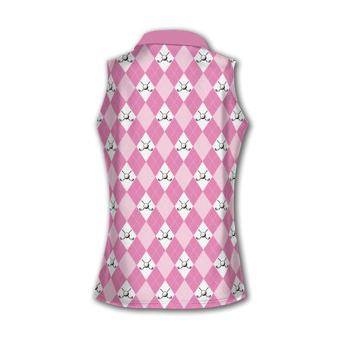 Custom Women's Pink Argyle Sleeveless Golf Shirt, Custom Womens Argyle Golf Shirt GE0020