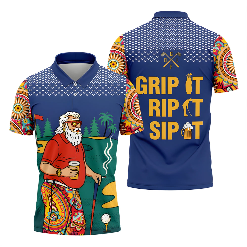 Grip It Rip It Sip It Santa Claus And Beer Golf Polo Shirt Mens, Funny Christmas Golf Shirts For Mens GB0003