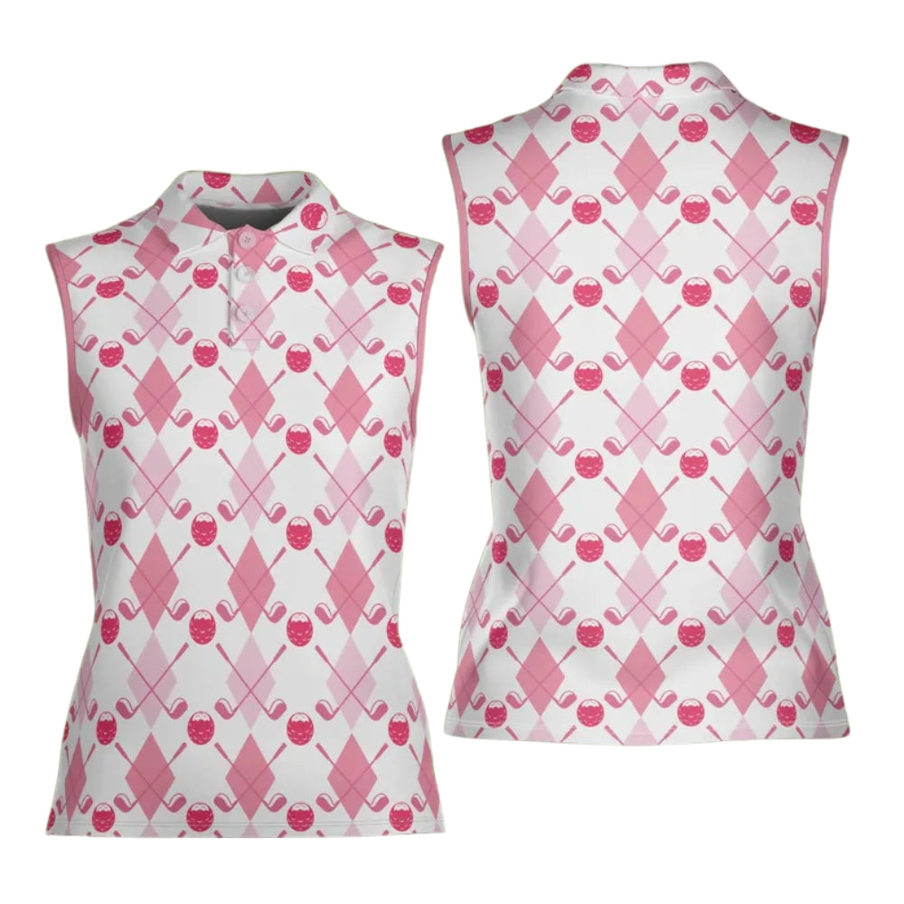 Pink Argyle Sleeveless Golf Shirt For Ladies, Women's Argyle Golf Shirts GE0180